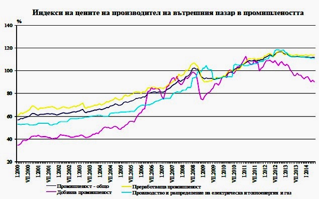 Намаление на цените е регистрирано в добивната промишленост - с 1.9%, и при производството и разпределението на електрическа и топлоенергия и газ - с 0.1%, докато в преработващата промишленост е отчетено увеличение - с 0.2%.