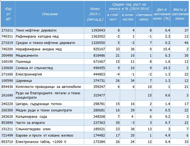 Както и в предишни години, водещите експортни групи стоки на България са горива и мед, следвани от електрически и електронни изделия и машини, житни растения. През последните десетина години експортният ръст при горива и мед изпреварва ръста на световния внос, увеличава се количеството, но и двете групи стоки през 2014 г. имат спад съответно с 16% за горива и 9% при медта.