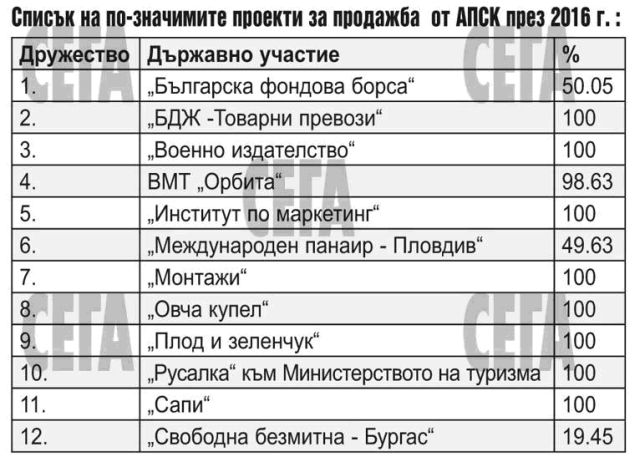 Към момента ведомството работи по проекта за продажба на държавния дял в капитала на фондовата борса. За това ще се търси стратегически инвеститор - голям борсов оператор. Целта е да се създадат предпоставки за развитие на фондовия пазар, за увеличаване на интереса на чуждите инвеститори и повишаване на капитализацията на пазара, обясняват от Агенцията за приватизация.