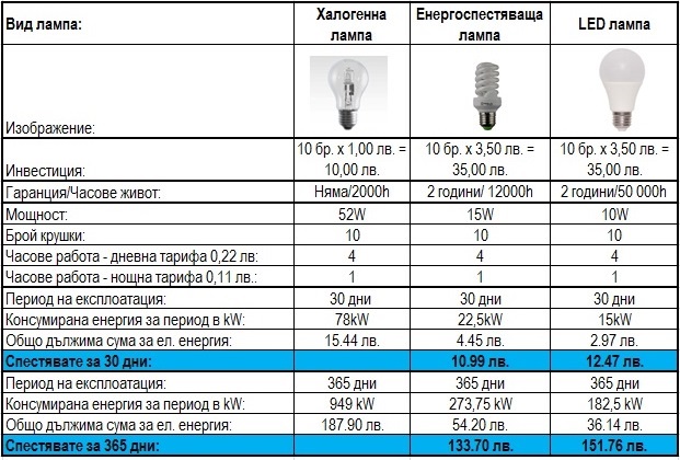 Изчисленията са направени за едно домакинство с 10 лампи, които работят по 5 часа в денонощието - 4 часа на дневна тарифа и 1 час на нощна.