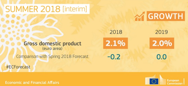 При представяне на лятната прогноза Валдис Домбровскис, заместник-председател на Комисията, отговарящ за еврото и социалния диалог, а също така и за финансовата стабилност, финансовите услуги и съюза на капиталовите пазари, заяви: Икономическата активност в Европа остава стабилна с прогнозиран ръст на БВП от 2,1 % за еврозоната и за ЕС-28 през тази година. Въпреки това понижаването на прогнозата за нарастването на БВП от месец май насам показва, че неблагоприятните външни фактори, като например нарастващото напрежение в търговските отношения със САЩ, може да доведат до понижаване на доверието и да се отразят неблагоприятно на икономическия растеж.