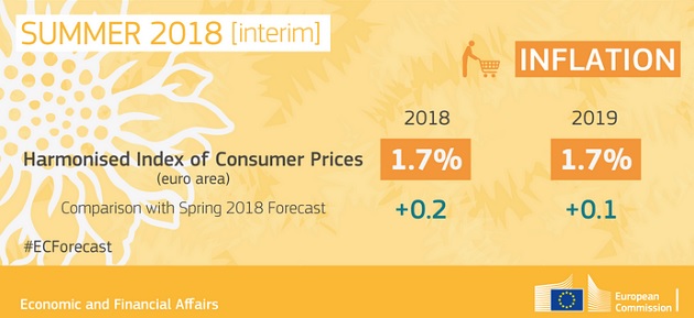 В резултат на покачването на цените на петрола от пролетта насам инфлацията през тази година се очаква да бъде средно 1,9 % в ЕС и 1,7 % в еврозоната. Това представлява повишение с 0,2 процентни пункта и в двете зони спрямо пролетта. Прогнозата за 2019 г. е повишена с 0,1 процентни пункта за еврозоната - на 1,7 %, но за ЕС остава непроменена - 1,8 %.