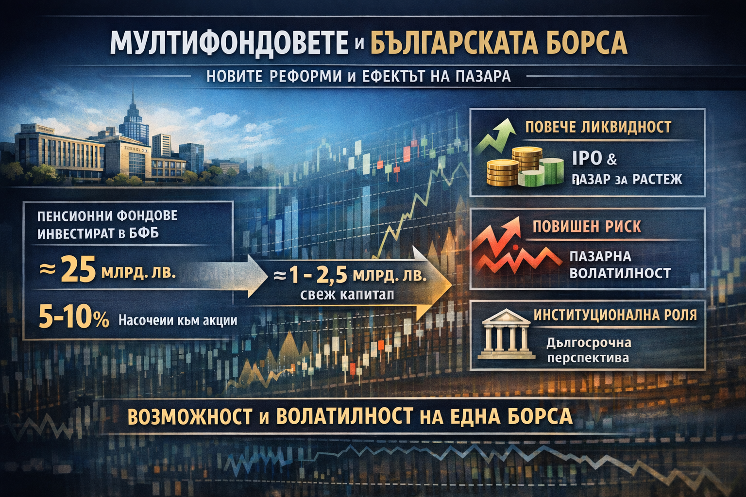 В крайна сметка потенциалното насочване на част от пенсионния капитал към Българската фондова борса е не толкова ценови катализатор, колкото структурен тест за зрелостта на пазара. Ако ресурсът бъде интегриран дисциплинирано и диверсифицирано, той може да увеличи дълбочината и стратегическата автономия на българския капиталов пазар. Ако обаче обемите изпреварят институционалния капацитет и корпоративната прозрачност, ликвидността може да се превърне в източник на волатилност. Истинската промяна няма да бъде в процентите, а в начина, по който пазарът абсорбира собствените си спестявания.