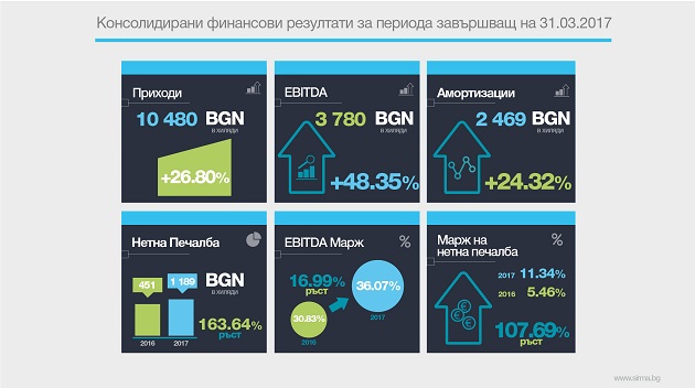 Особено голямо е нарастването на нетната печалба в сравнение с първото тримесечие на миналата година - ръст от 163,64%, като тя достига до 1189 хил. лв. за първото тримесечие на 2017 година. EBITDA отбелязва ръст от 48,35% и достига BGN 3780 хиляди. Маржът на EBITDA отбелязва леко покачване и достига 36,07% за първото тримесечие на 2017 година.