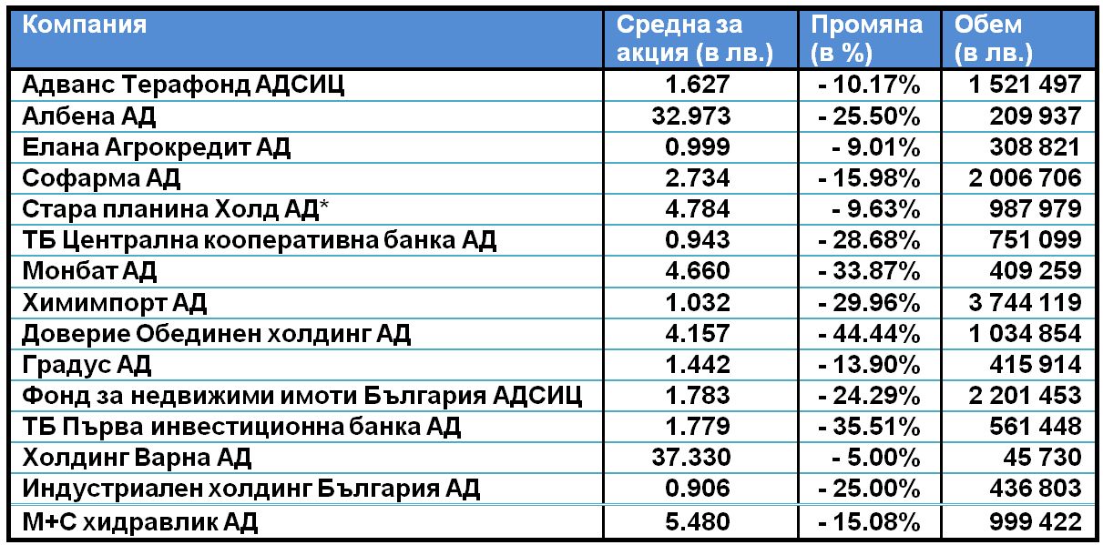 В SOFIX след 23 март 2020 година останаха четири холдинга, между които с най-голяма загуба е Доверие Обединен холдинг (-44.44%), следван от: Индустриален холдинг България (-25.00%), Стара планина холд (-9.63%) и с най-малка загуба Холдинг Варна (-5.00%).