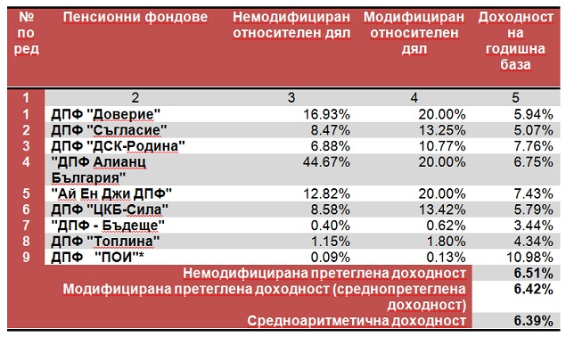 От таблиците по-долу става ясно, че през 2014 г. всички пенсионни фондове са покрили изискваният за минималната доходност, а средно аритемтичната доходност е както следда: за универсалните пенсионни фондове е 5.12%, за професионалните пенсионни фондове - 5.32%, за доброволните пенсионни фондове - 6.39%. Единственият доброволен пенсионен фонд по професионални схеми „ДСК-Родина", в който работещите в първа и втора категория труд могат по свое желание да се осигуряват, постига доходност от 6,92% за последните две години.