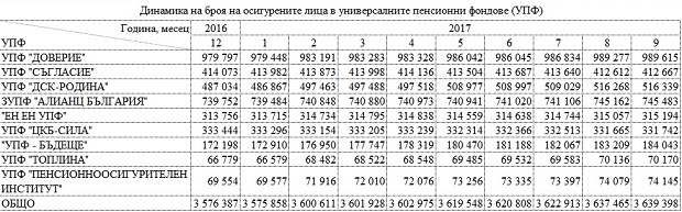 Общият брой на осигурените лица в четирите вида пенсионни фондове към 30.09.2017 г. е 4 552 740 души, като нараства спрямо 30.09.2016 г. с 2,46 на сто.