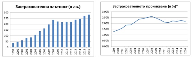 През 1999 г. застрахователната плътност, която се измерва като брутният премиен приход на глава от населението на България, е била едва 38 лв. През следващите 9 години до 2008 г. ръстът на заделяните средства от всеки един гражданин на страната е значителен (524 %) и достига 237 лв. В периода на кризата (2009-2012 г.) се отбелязва лек спад до около 220 лв., отразяващ намаления премиен приход в общото застраховане. От 2013 г. насам секторът се възстановява и показателят надминава още през 2014 г. нивото от 2008 г. За 2016 г. застрахователната плътност е вече 282 лв., което представлява един стабилен растеж от около 6 % на годишна база в сравнение с 2012 г.