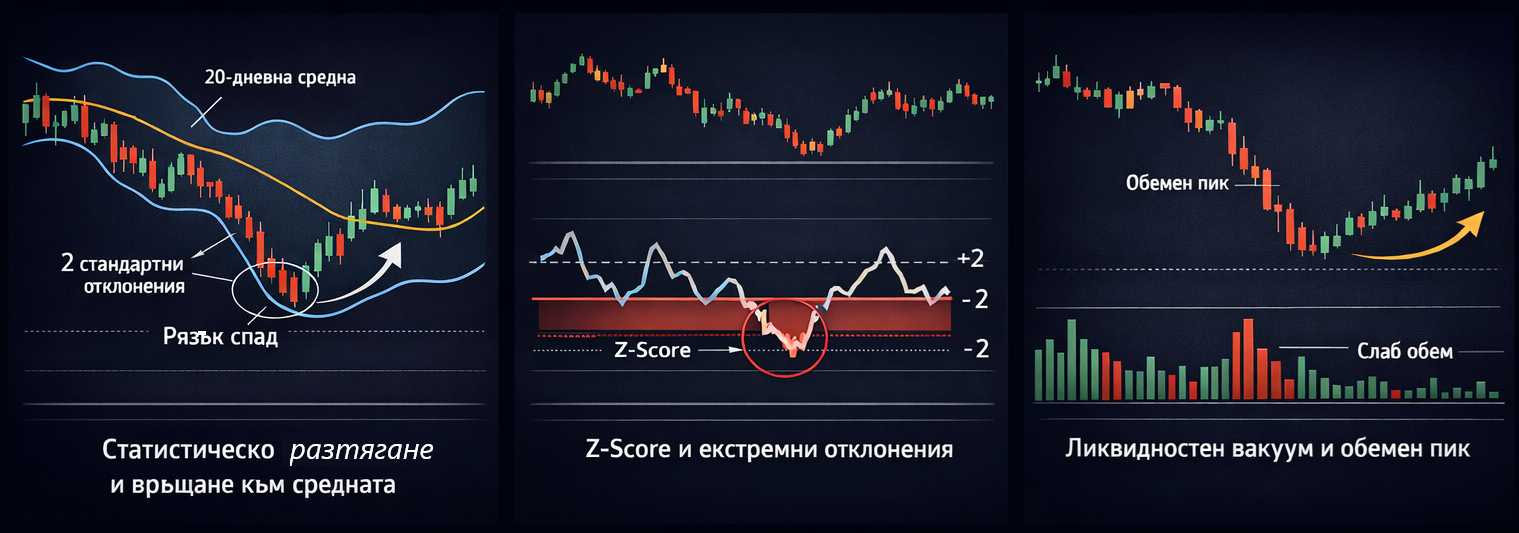 Когато дадена акция или индекс започне да пада рязко, причината невинаги е фундаментална промяна в стойността. Често става дума за временно натрупване на продавачи, за маржин изисквания, за алгоритмично ускоряване на спада или за внезапен поток от средства извън борсово търгувани фондове. В подобни моменти спредовете се разширяват, обемите нарастват, а цената се отдалечава от краткосрочната си средна стойност. Този процес създава ликвидностен вакуум. Цената пада по-бързо, отколкото би го направила при нормална дълбочина на пазара. Mean reversion стъпва именно тук. Не върху идеята, че пазарът греши, а върху допускането, че временният дисбаланс ще бъде изчистен.