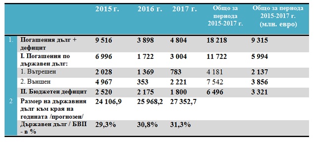 Очакваният размер на погашенията по държавния дълг, в обращение към 31.12.2014 г., за периода 2015-2017 г. възлиза на около 6 млрд. евро. Очакваният размер на бюджетните дефицити за периода 2015-2017г. е около 6.5 млрд. лв. (3.32 млрд. евро).