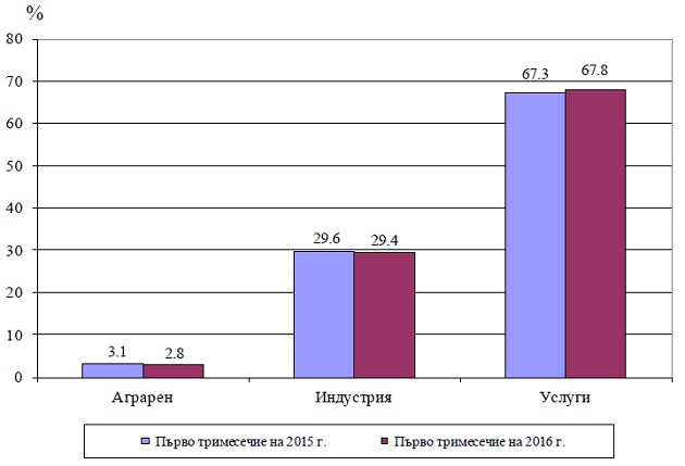 През първото тримесечие на 2016 г. относителният дял на аграрния сектор в добавената стойност на икономиката намалява равнището си с 0.3 процентни пункта спрямо същото тримесечие на предходната година, достигайки до равнище от 2.8%. Индустриалният сектор намалява относителния си дял в добавената стойност на икономиката с 0.2 процентни пункта и достига до ниво от 29.4%. Относителният дял на добавената стойност, реализирана от дейностите в сферата на услугите, се увеличава и достига до ниво от 67.8% при 67.3% през съответния период на предходната година.