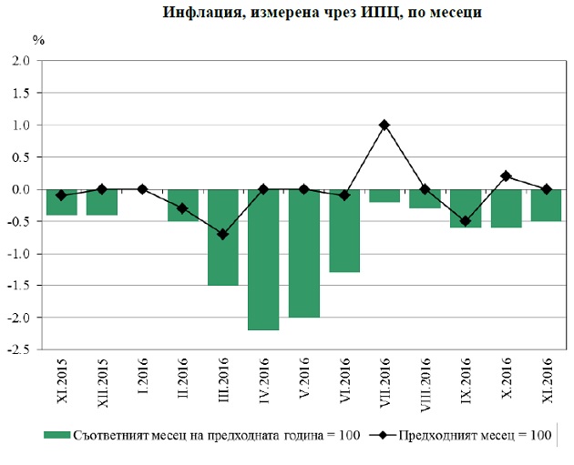 Индексът на потребителските цени за ноември 2016 г. на месечна база спрямо октомври 2016 г. е 100.0%, т. е. месечната инфлация е 0.0%. От началото на годината (ноември 2016 г. спрямо декември 2015 г.) обаче Националния статистически институт (НСИ) отчита дефлация от 0.5% Същият показател е и годишната инфлация (спрямо ноември 2015 г.).