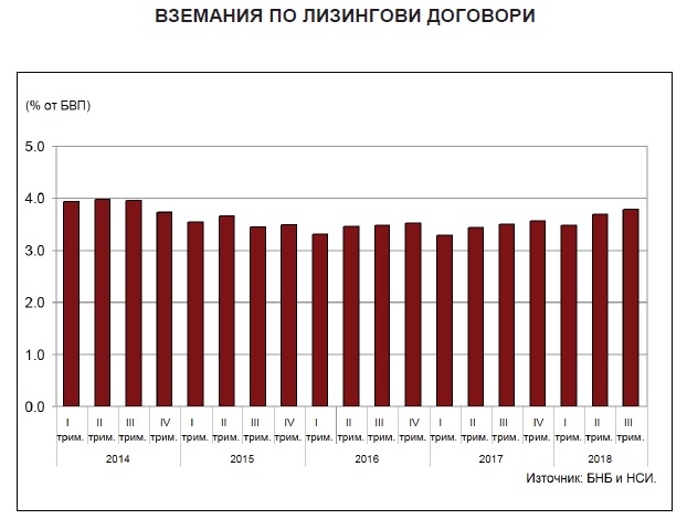 Според обявените в петък данни на БНБ, вземанията и по финансов, и по оперативен лизинг в края на септември 2018 г. са общо 3.950 млрд. лв. (3.8% от БВП) при 3.535 млрд. лв. (3.5% от БВП) в края на септември 2017 година. В края на третото тримесечие на 2018 г. на годишна база нарастването е с 11.7% (415.2 млн. лв.), а спрямо края на юни 2018 г. - с 2.3% (88 млн. лева).