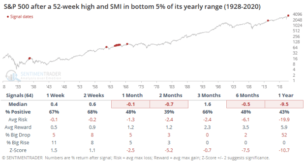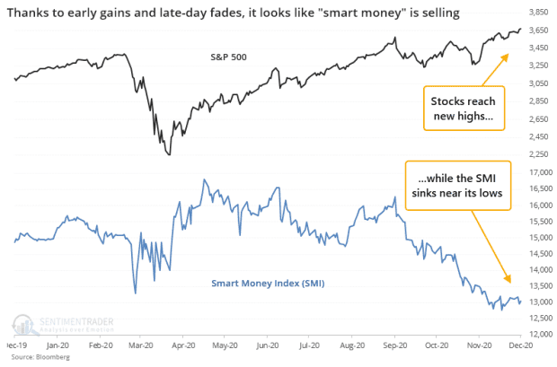 Данните на SentimenTrader показват, че SMI се доближава до най-ниското си ниво през годината, което предполага, че интелигентните пари може да правят пауза, докато пазарите достигат до нови висоти.