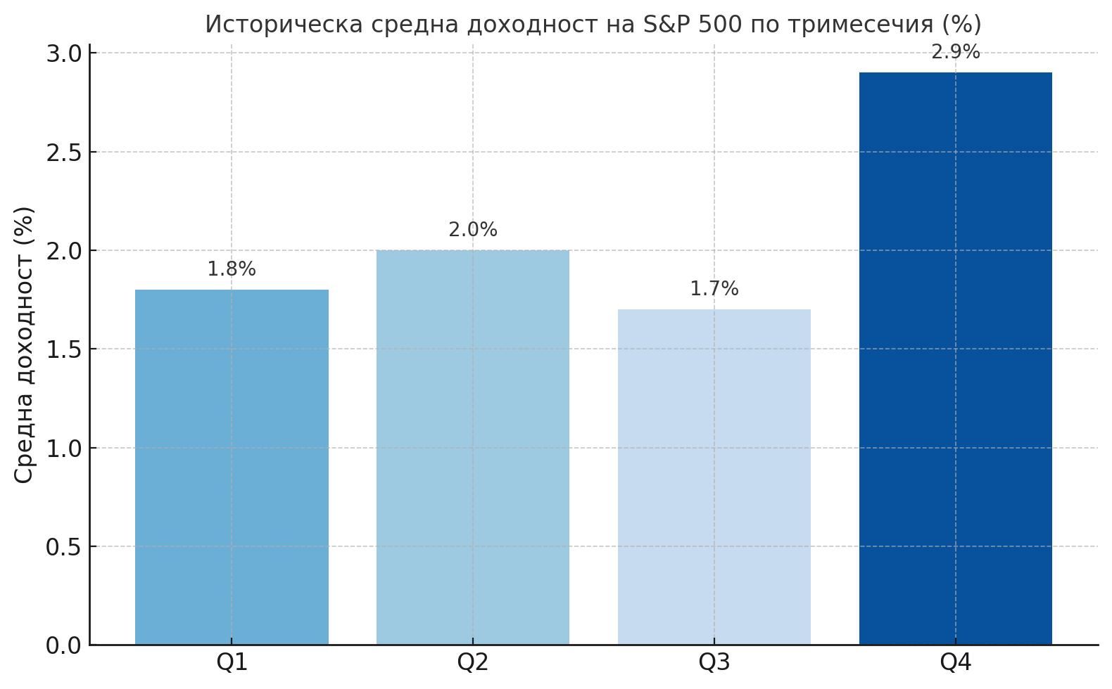 Историята на пазарите има навика да римува, а сезонността често се оказва един от най-стабилните рими, които трейдърите и инвеститорите наблюдават. Данните на Bespoke Investment Group за представянето на S&P 500 през четвъртото тримесечие са особено интересни, защото потвърждават това, което много ветерани на Уолстрийт знаят от опит – последните три месеца на годината носят най-силната историческа възвръщаемост за широкия индекс. Средното повишение от 2.9% в последното тримесечие, на фона на 2.1% средна печалба за всички останали, изглежда малка разлика на пръв поглед. Но когато погледнем под повърхността, картината става още по-убедителна – в годините, когато индексът вече е бил на плюс след деветмесечието, четвъртото тримесечие е носело средно 4.4% ръст, с вероятност за положителен резултат над 83%.