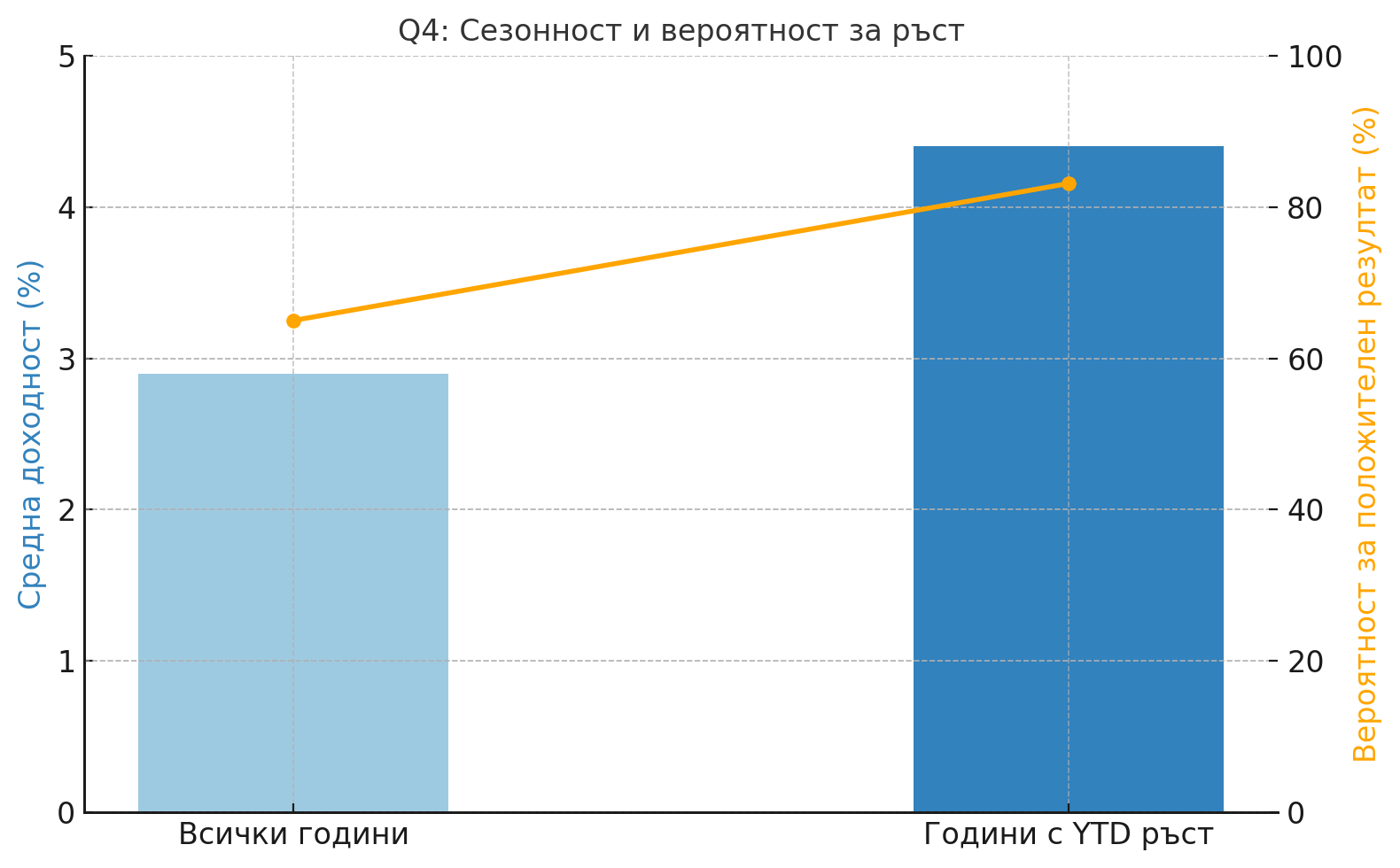 Историческият контекст не може да бъде пренебрегнат. През последните 30 години сезонният ефект в четвъртото тримесечие се е засилил, което означава, че в модерната ера на алгоритми, пасивни фондове и масови пенсионни вноски тази закономерност се е закрепила още повече. Това прави вероятността за повторение по-голяма, но в същото време увеличава и опасността от прекалена увереност. Ако твърде много инвеститори залагат на същата посока, рискът от корекция при неочаквано събитие нараства. Едно геополитическо напрежение, неочаквано решение на Фед или шок от трудовия пазар може бързо да обърне тенденцията.