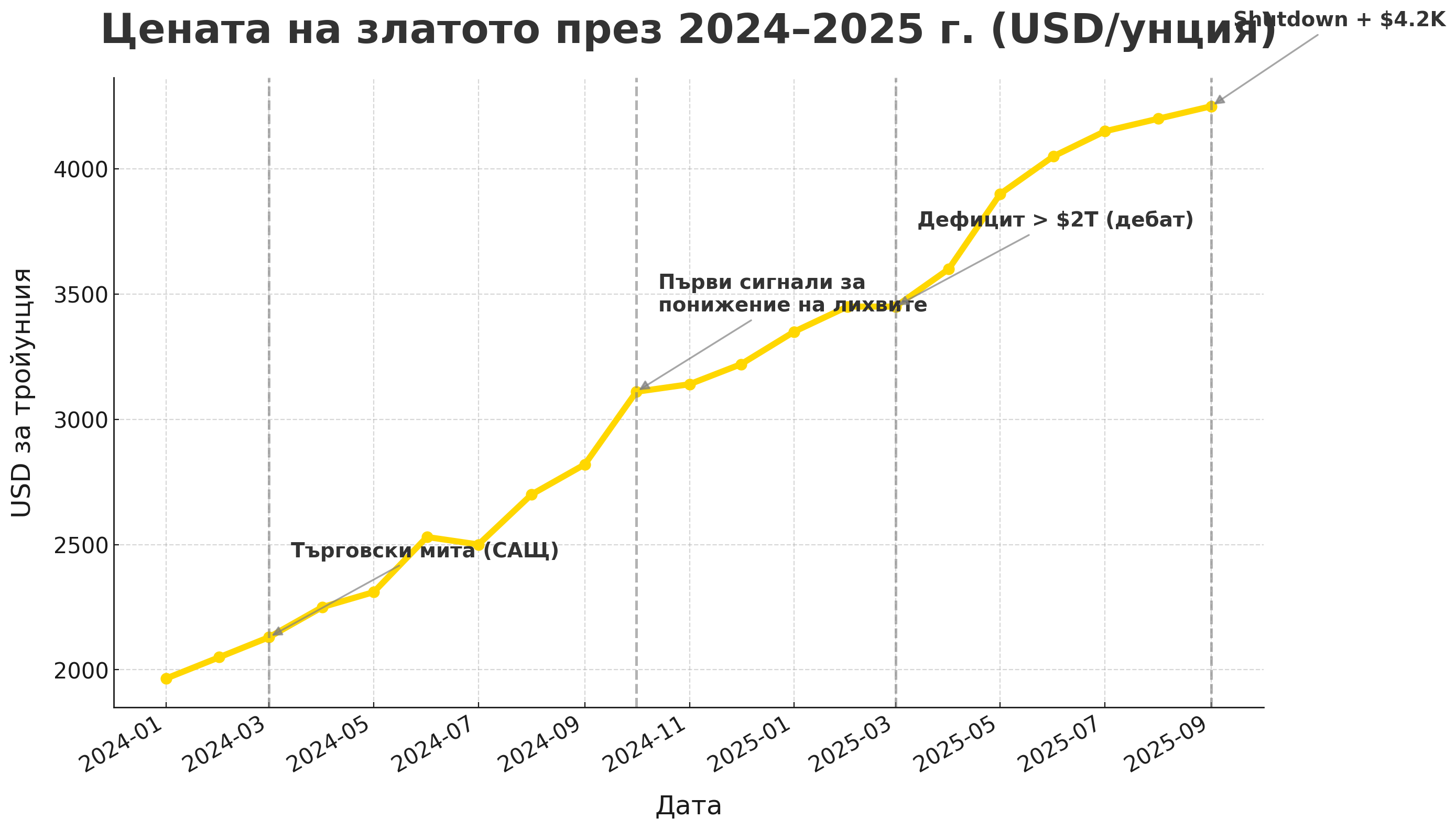 Пазарът говори кратко и ясно: когато правилата се променят по-често от прогнозите, капиталът търси убежище, което не зависи от ничий баланс. Златото прехвърли прага от 4 200–4 300 долара за тройунция в среда, в която едновременно текат бюджетни дефицити, митнически експерименти и натиск върху централните банки. Тази цена не е единичен шип, а израз на нов режим на търсене — такъв, в който инвеститорите купуват не „история за растеж“, а функционална сигурност: ликвидност, преносимост, глобална конвертируемост.