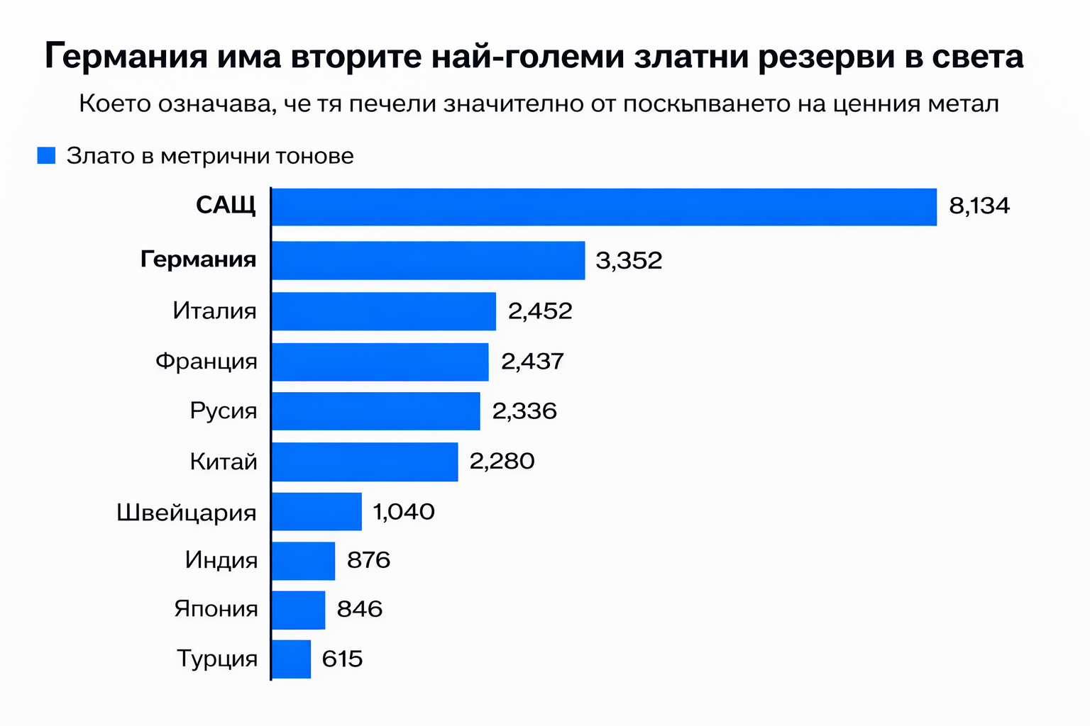 В по-дълбок план германското злато е симптом на по-широка дилема. В свят, в който доверието към валути, институции и съюзи ерозира, златото отново се превръща в политически актив. Това обяснява защо страни като Полша агресивно увеличават резервите си, докато Германия – с много по-голям запас – не смее да го докосне. Металът не носи лихва, но носи спокойствие. И точно това спокойствие е трудно да бъде превърнато в инфраструктура, растеж или социална стабилност.