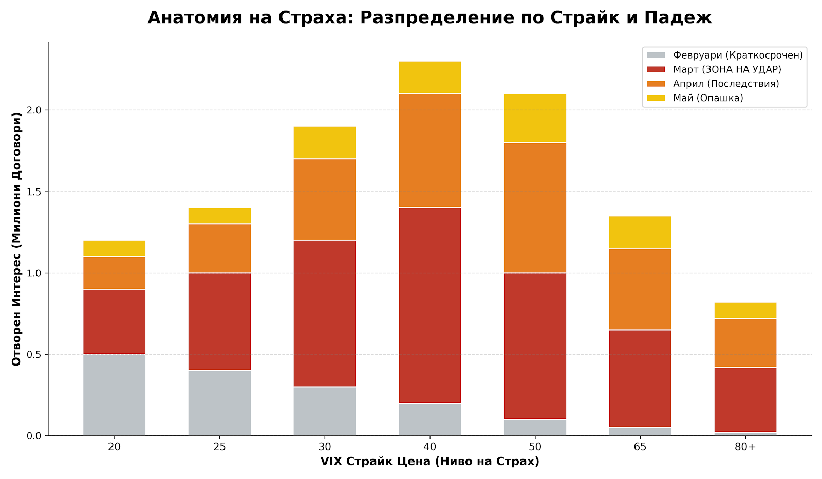 Графиката разкрива не просто обем, а времеви хоризонт на очаквания хаос. Докато февруарските позиции (в сиво) са сравнително скромни и концентрирани в ниските нива, истинската „стена“ от капитал е издигната през март (червените сектори) при страйкове 40 и 50. Това струпване показва, че големите играчи не очакват незабавен срив днес, а се позиционират агресивно за събитие с висок магнитуд след месец – стратегически залог, че напрежението ще се акумулира до точка на кипене точно преди пролетта.