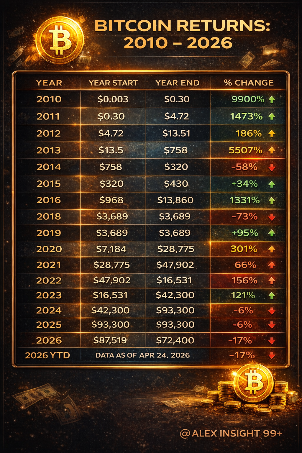 Биткойн е актив, който не може да бъде разбран нито през класическата призма на „оценка“, нито като обикновена спекулативна мания. Историческото му представяне показва ясно очертана структура, в която експоненциалният растеж и дълбоките спадове не са изключения, а неизбежни фази на един и същ процес. Таблицата с годишните резултати от 2010 до 2026 г. изглежда на пръв поглед хаотична, но всъщност разкрива повтарящ се ритъм: екстремни години на експанзия, последвани от години на сурова корекция и изчистване, след което идва нов, по-бавен и по-зрял възход.