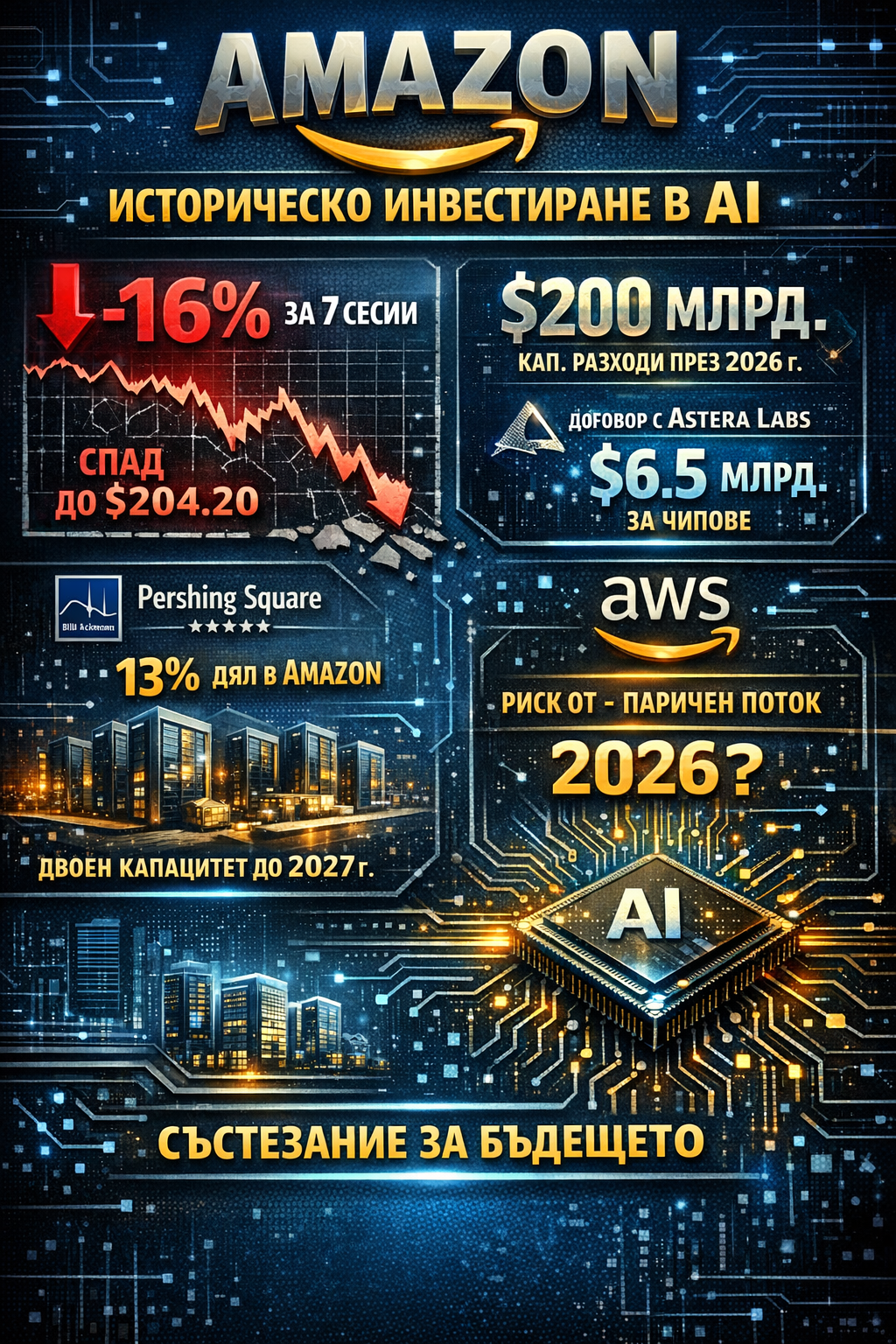 Amazon преживява най-силния си седемдневен спад от 2022 г. насам, като акциите се понижиха с 16% до 204.20 долара – движение, което не беше предизвикано от слаб отчет, а от мащаба на амбицията. Компанията обяви, че планира капиталови разходи от 200 милиарда долара през годината – най-високата прогноза сред мегатехнологичните хиперскейлъри – и именно тази цифра промени психологическия режим на пазара.