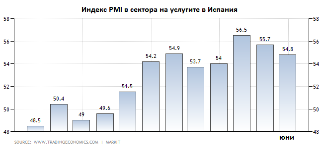 Индексът PMI за сектора на услугите се е понижил до 54.6 пункта през шестия месец на годината, спрямо достигнатия 35 месечен връх през май от 56 пункта. Прогнозите на анализатори бяха за спад до 54.8 пункта. Индексът остана в областта на развитие (над 50 пункта) за 13 пореден месец.