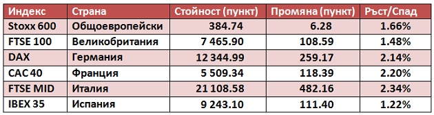 След първоначалния спад, общоевропейският индекс Stoxx 600 нарасна до обяд с 0.73%. Около час и половина преди да затворят борсите в Западна Европа индексът се ускорява повече от два пъти.